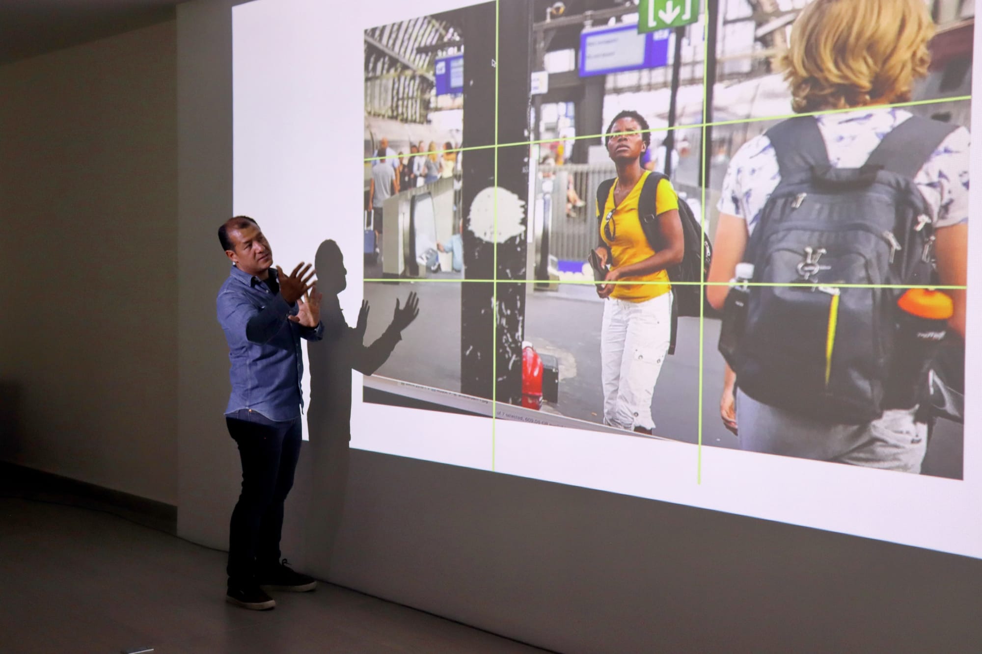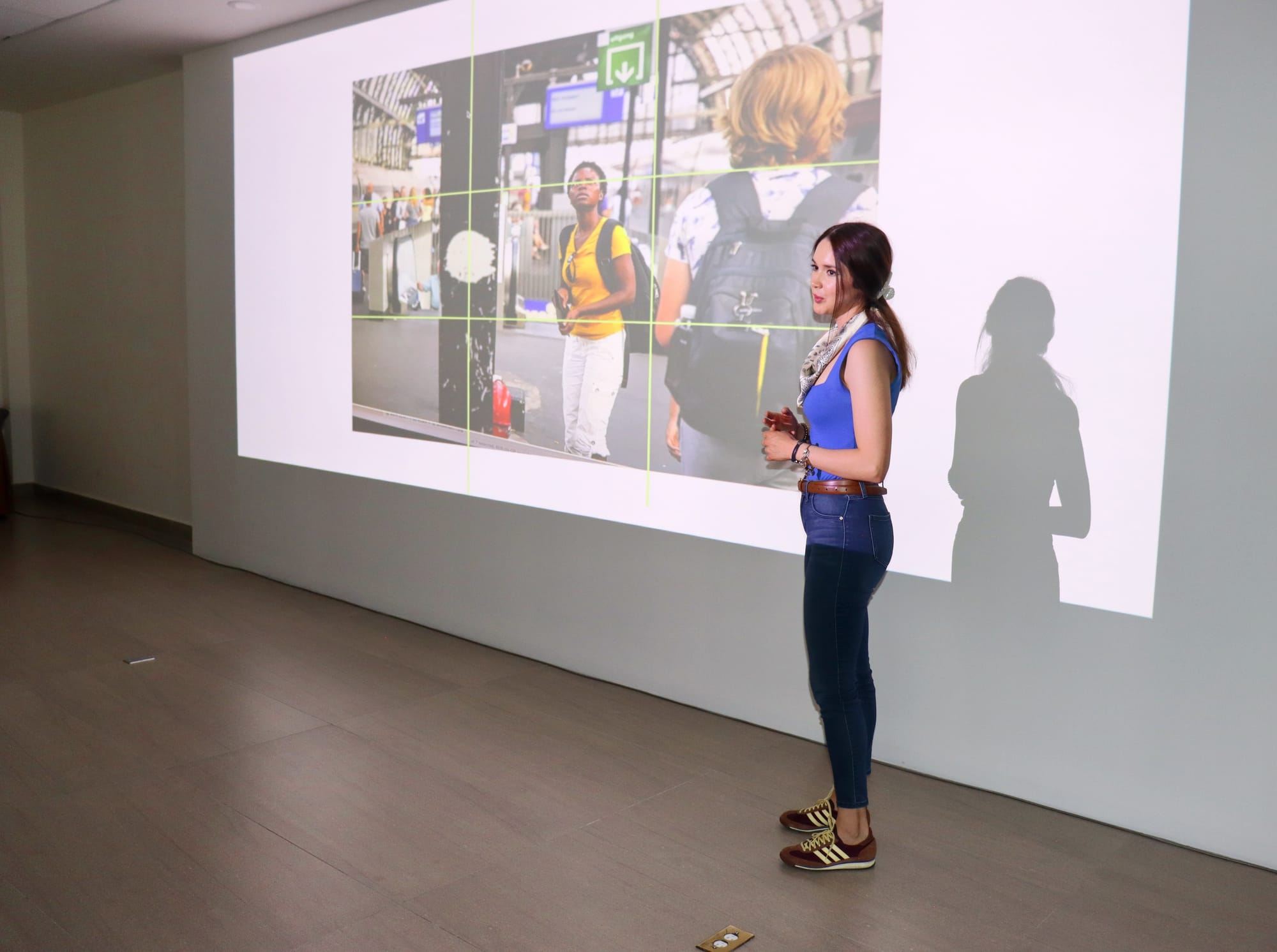 El taller abordó principios fundamentales como la regla de los tercios, líneas de composición, equilibrio visual y geometría en la imagen, explicando cómo estos elementos influyen en la forma en que el cerebro interpreta una fotografía. A través de ejemplos prácticos, se mostró cómo una imagen puede construirse a partir de múltiples capas visuales, líneas y puntos de atención que generan armonía y narrativa.